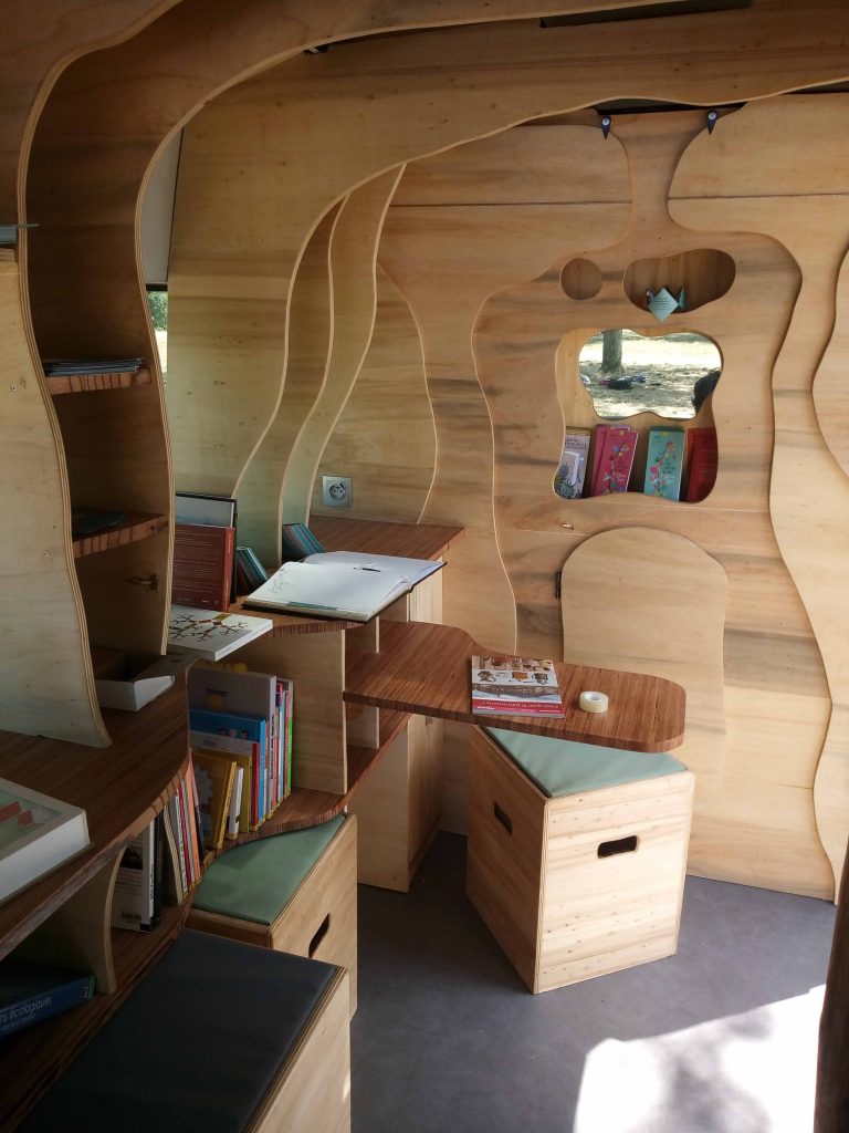 Les courbes et le bois évoquent le paysage. Les courbes de niveaux, les éléments organiques, la biodiversité sont autant de composants dans lesquels tout projet d’architecture doit s’inscrire. Tablettes, banquette/coffre, tabouret, système amovible pour maintien des livres pendant le transport, tout le mobilier a été fabriqué en bois contreplaqué produit localement (peuplier).